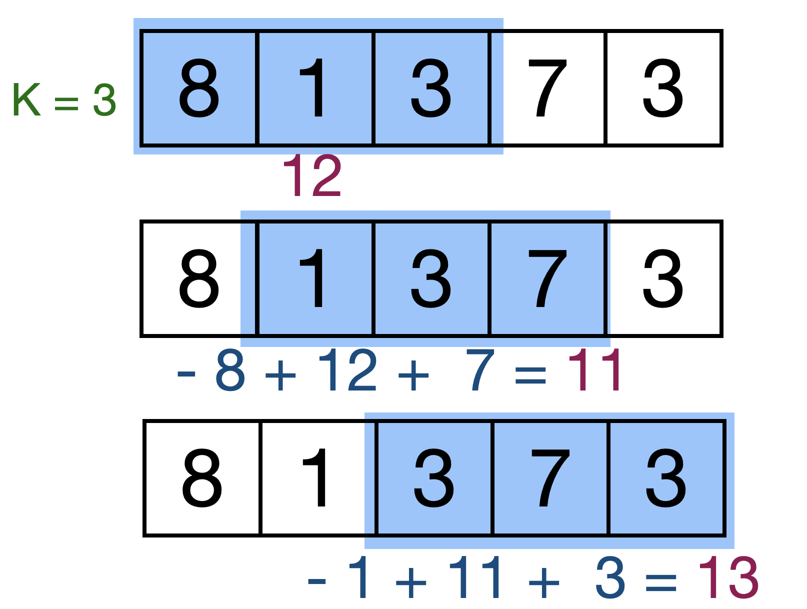 Get initial sum of array of size K, then for following sub-arrays subtract the previous number (first number outside the window to the left) and add next number (last number inside the window to the right)