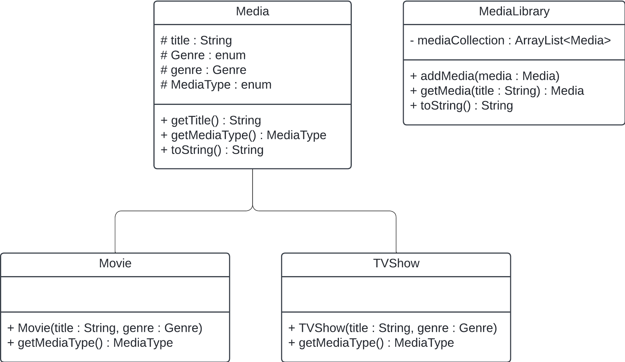 public class MyMediaLibrary { public static void main(String[] args) { MediaLibrary myMediaLibrary = new MediaLibrary(); myMediaLibrary.addMedia(new Movie("The Alien", Media.Genre.SCIFI)); myMediaLibrary.addMedia(new TVShow("The X-Files", Media.Genre.SCIFI)); myMediaLibrary.addMedia(new TVShow("Seinfield", Media.Genre.COMEDY)); System.out.println(myMediaLibrary.toString()); }}